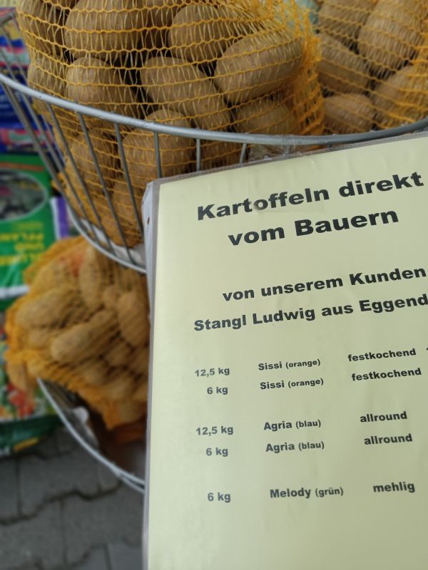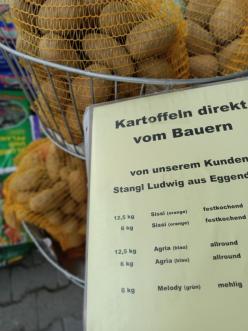 Seit kurzem können wir wieder etwas Neues für unsere Kunden anbieten: Unser Kunde Stangl Ludwig aus Eggendorf betreibt seit Jahren Gemüseanbau, unter anderem auch Kartoffeln. Wir freuen uns, dass wir nun von Ludwig Stangl beliefert werden und diese, mit EM (Effektiven Mikroorganismen) behandelten Kartoffeln, in unserem Laden verkaufen dürfen. Es gibt drei verschiedene Sorten: die Sorte Sissi (festkochend, oranges Etikett), die Sorte Agria (allround, blaues Etikett) und die Sorte Melody (mehlig kochend, grünes Etikett). Beste Qualität – direkt vom Bauern – was will man mehr?