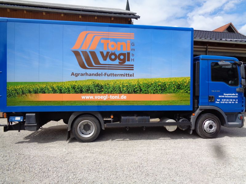 Leider mussten wir uns altersbedingt von unserem guten alten LKW trennen. Es war absehbar und doch kam es überraschend. Dennoch sind wir glücklich, einen passenden Ersatz gefunden zu haben. Im Einsatz ist er schon wieder eine Weile und wurde fleißig eingefahren. Den Vorteil, dass der Neue eine Hebebühne hat und wir bei unseren Landwirten nun selbständig ausladen können, haben wir schon fleißig genossen. Aber jetzt hat er sein I-Tüpfelchen bekommen – unser Logo! Kürzlich konnten wir ihn frisch bedruckt mit unserem Firmenlogo und unserem Bild in Empfang nehmen! Besonders freut uns, dass es unsere eigenen Bilder sind, die wir hier platzieren ließen! Seitlich am Koffer, ein Sonnenblumenfeld von unserem eigenen Zwischenfruchtversuch von letztem Jahr. Hinten an der Hebebühne haben wir ein Foto von unserer letztjährigen Zwischenfruchtversuchsanlage gesetzt.