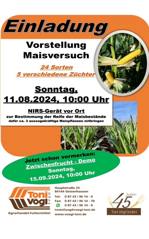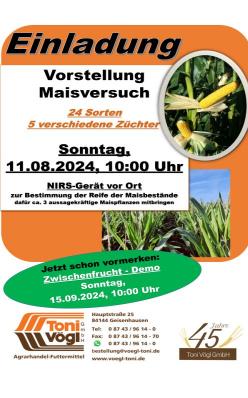 Geisenhausen/Hohenegglkofen. Am Sonntag, 11.08.2024 findet von der Firma Agrarhandel Vögl Geisenhausen um 10:00 Uhr der Maisfeldtag in Oberfimbach statt. Es wird die Demo-Anlage mit insgesamt 24 Maissorten von den 5 verschiedenen Züchtern agaSaat, MasSeeds, Eurocorn, Dekalb und Saaten Union präsentiert. Die Vorstellung erfolgt gemeinsam mit den Vertretern der Firmen. Die einzelnen Sorten werden vorgestellt und Ihre Eigenschaften erläutert. Es sind interessante, vielversprechende neue Sorten dabei. Laut der Silomais-Prognose der LfL Bayern liegen 2024 die Temperatursummen beim früh gesäten Mais bereits deutlich über dem langjährigen Durchschnitt. Die Siloreife wird beim Mais dadurch eher erreicht.