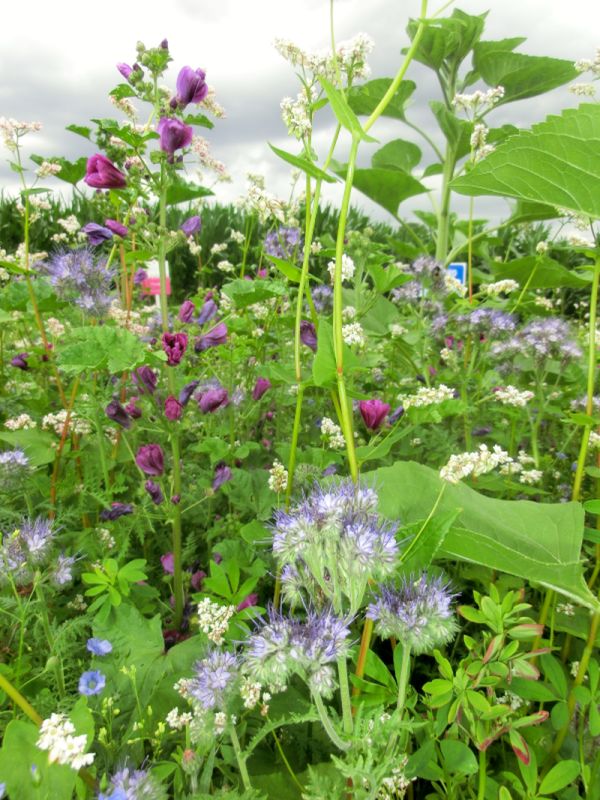 Das ist unsere „Blühende Honigquelle“. Der Blühstreifen wurde Ende April am Maisrand entlang unseres Versuchsfeldes in Oberfimbach gesät. Die Mischung enthält 24 verschiedene Samen und erstrahlt derzeit in voller Blüte. Sie erfreut aber nicht nur das Auge, sondern vor allem unsere Insekten. Wenn man entlang spazieren geht, wimmelt es nur so von Bienen, Hummeln und Schmetterlingen, die ein richtiges „Summ-Konzert“ geben. Durch diesen Blühstreifen bieten wir unseren Bienen wichtige Nahrung und Lebensraum und tun ebenso unserem Boden was richtig Gutes. Denn die Sämereien sind so abgestimmt, dass sie für eine tiefe Bodendurchwurzelung und für einen lockeren Boden sorgen, Bodennährstoffe aktivieren und zudem Erosionsschutz bieten.