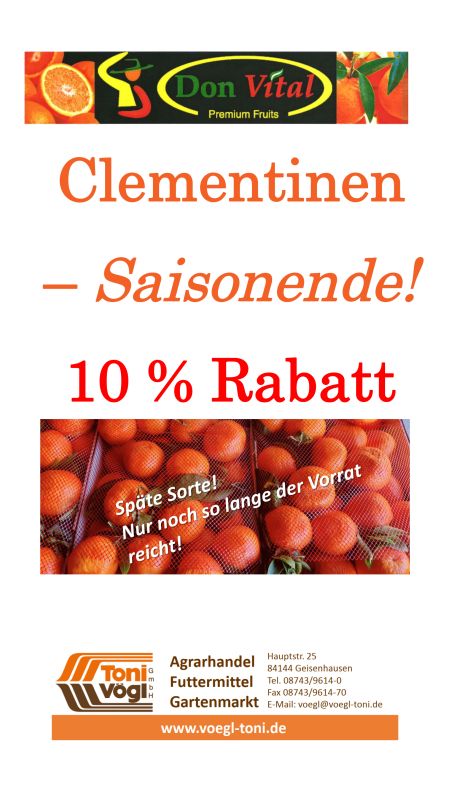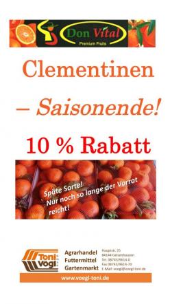 Bei den Clementinen heißt es jetzt Endspurt! Die Ernte der späten Sorte der Clementinen ist nahezu abgeschlossen. Somit geht die Clementinen – Saison langsam aber sicher zu Ende. Die letzten späten Früchte sind einfach wunderbar, sehr groß, süß und saftig. Ein wahrer Genuss, von dem wir uns nun langsam verabschieden müssen. Zum Endspurt gibt es bei uns noch 10 % Rabatt auf diese leckeren Clementinen.