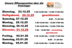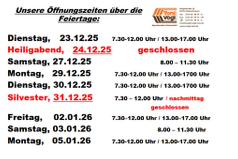 Wir haben an Heiligabend geschlossen! Wir haben eine frische Lieferung an Orangen, Clementinen und Zitronen bekommen und sind am 23.12.25 für Sie liebe Kunden aber bis 17 Uhr da! Auch zwischen den Feiertagen haben wir zu den gewohnten Öffnungszeiten auf! An Silvester haben wir nur bis 12:00 Uhr auf, nachmittags geschlossen!