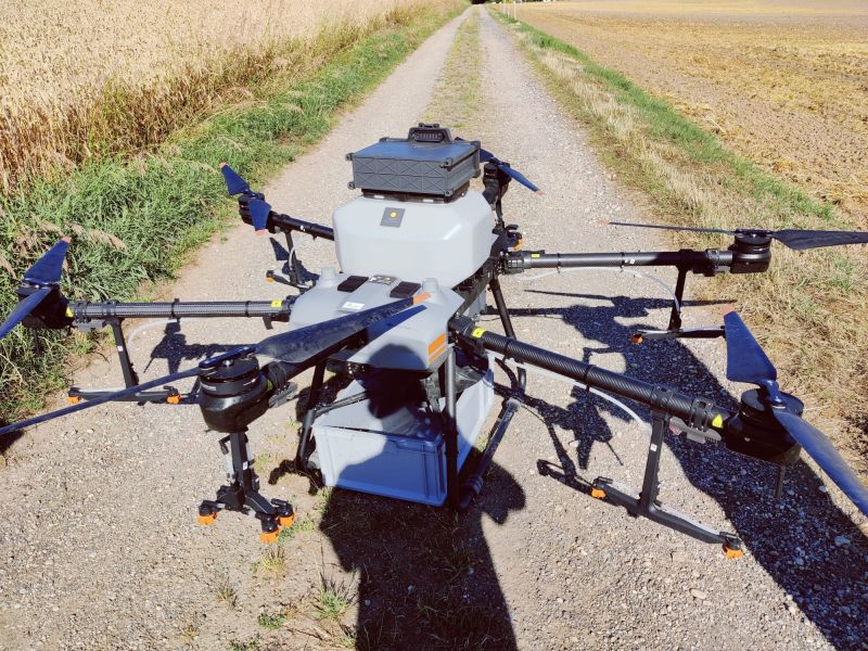 Am Samstag haben wir einen Versuch durchgeführt. Die Firma Burghart Engineering war bei uns und hat mit der Drohne auf einem Teil unseres Gerstenfeldes unsere Zwischenfruchtmischungen ausgesät. Dabei wurden auch verschiedene Mischungen von uns ausprobiert. Gesät wurde auf Stoppeln. Mit der Drohnenaussaat kann man natürlich auch in den Bestand sähen (hier kam bei uns leider der Mähdrescher zu früh). Der Vorteil dieser Aussaatmethode ist, dass eine wesentlich frühere Aussaat der Zwischenfrucht möglich ist, da sie bereits zwei bis fünf Wochen vor der Ernte des Getreides gesät werden kann.