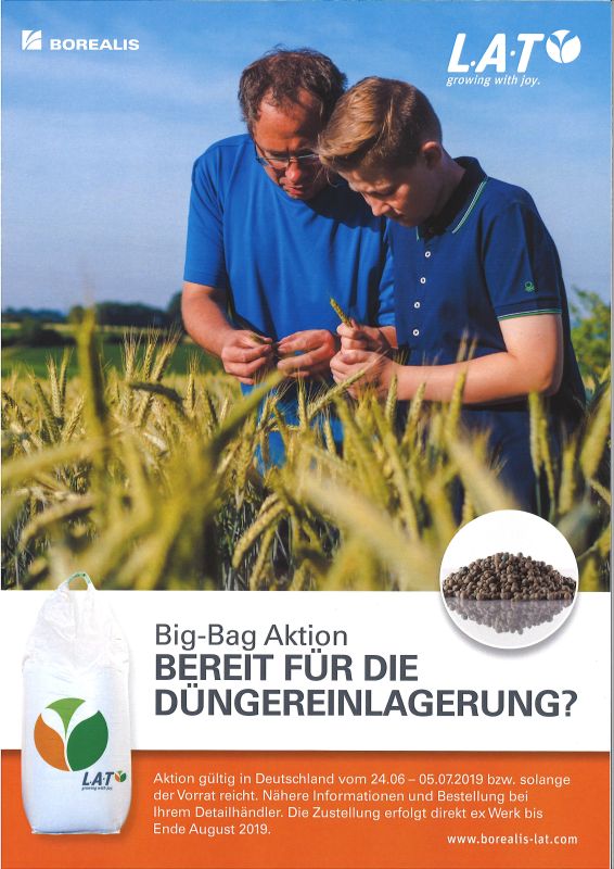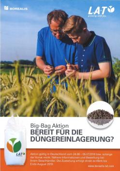 Landwirte aufgepasst - ab heute läuft die Big-Bag Aktion von Borealis. Bei Borealis L.A.T erhalten Sie ein Produkt „made in Austria“ mit geprüftem Nährstoffgehalt und höchster Löslichkeit, sowie besten Streueigenschaften. Die Aktion läuft von 24.06.2019 – 05.07.2019, bzw. so lange der Vorrat reicht. Der Dünger wird in Big-Bags bis Ende August direkt ab Werk zugestellt. Bei den Original-Big-Bag von Borealis mit Innensack ist beste Lagerfähigkeit für die Düngereinlagerung garantiert. Der Dünger lagert im Big Bag trocken und sauber, so wird die optimale Rieselfähigkeit erhalten.