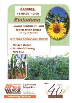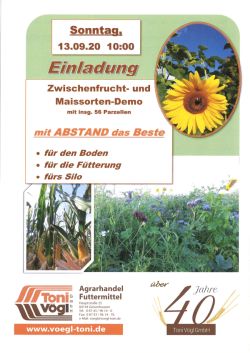 Geisenhausen/Hohenegglkofen. Am Sonntag, 13.09.2020 findet von der Firma Agrarhandel Vögl Geisenhausen ab 10.00 Uhr der Mais- und Zwischenfruchtfeldtag in 84036 Oberfimbach 25 statt. Die Maisfirmen und Züchter agaSaat, Eurocorn, Maisadour, Saatbau Linz und DSV präsentieren ihre neuen Sorten für die kommende Saison mit 27 verschiedenen Züchtungen. Neu ist heuer, dass eine Teilfläche mit Fahrgassen gebaut wurde mit späterer Gülledüngung und so verglichen werden kann.