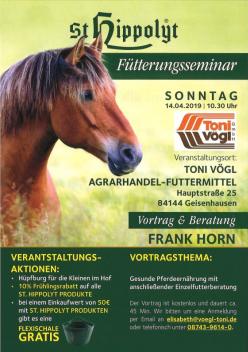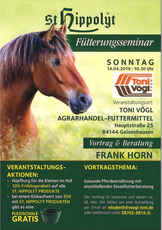 Die Woche vom 08.04.2019 bis 14.04.2019 steht in Geisenhausen ganz unter dem Motto "Gesundheit und Wellness". Wir haben dieses Thema für die Pferde aufgegriffen. Am Verkaufsoffenen Sonntag, 14.04.2019 um 10.30 Uhr veranstalten wir bei uns im Betrieb für alle Pferdefreunde ein Fütterungsseminar. Das Vortragsthema lautet "Gesunde Pferdeernährung". Anschließend besteht die Möglichkeit zur Einzelfutterberatung. Herr Horn von St. Hippolyt zeigt viele interessante und wichtige Erkenntnisse im Bereich der Fütterung auf. Die Veranstaltung ist kostenlos und dauert ca. 45 Minuten. Zudem bieten wir an diesem verkaufsoffenen Sonntag viele Aktionen. Bei einem Einkaufswert von 50 EUR mit St. Hippolyt Produkten gibt es ein Flexischale GRATIS. Außerdem bieten wir 10 % Rabatt auf alles Pferdefutter. Für unsere kleinen Besucher steht bei uns im Hof eine Hüpfburg zur Beschäftigung. Also nutzen Sie die Gelegenheit und besuchen Sie uns am 14.04.2019 um 10.30 Uhr!