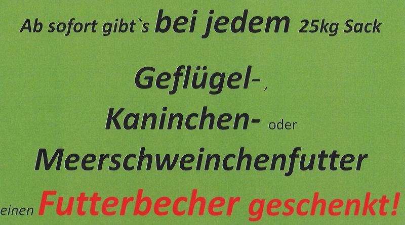 Hobby-Farming liegt voll im Trend! Und diesen Trend fördern wir, denn beim Kauf von einem Sack unseres Futters gibt’s ab sofort einen Futterbecher gleich gratis dazu! Das Geschenk gibt es ab einem 25kg Sack eines Kaninchenfutters, Geflügel- oder Meerschweinchenfutters! All unser Futter ist genfrei! Gerade beim Geflügelfutter bieten wir eine große Auswahl an: Legemehl, Legekorn, Enten- / Gänse-/ Geflügelmast, Kükenaufzucht oder Geflügelkörnerfutter! Unser Futter unterscheidet sich von anderen Futtern: Denn alles Geflügelfutter ist zusätzlich mit LIKRA-SAN angereichert: