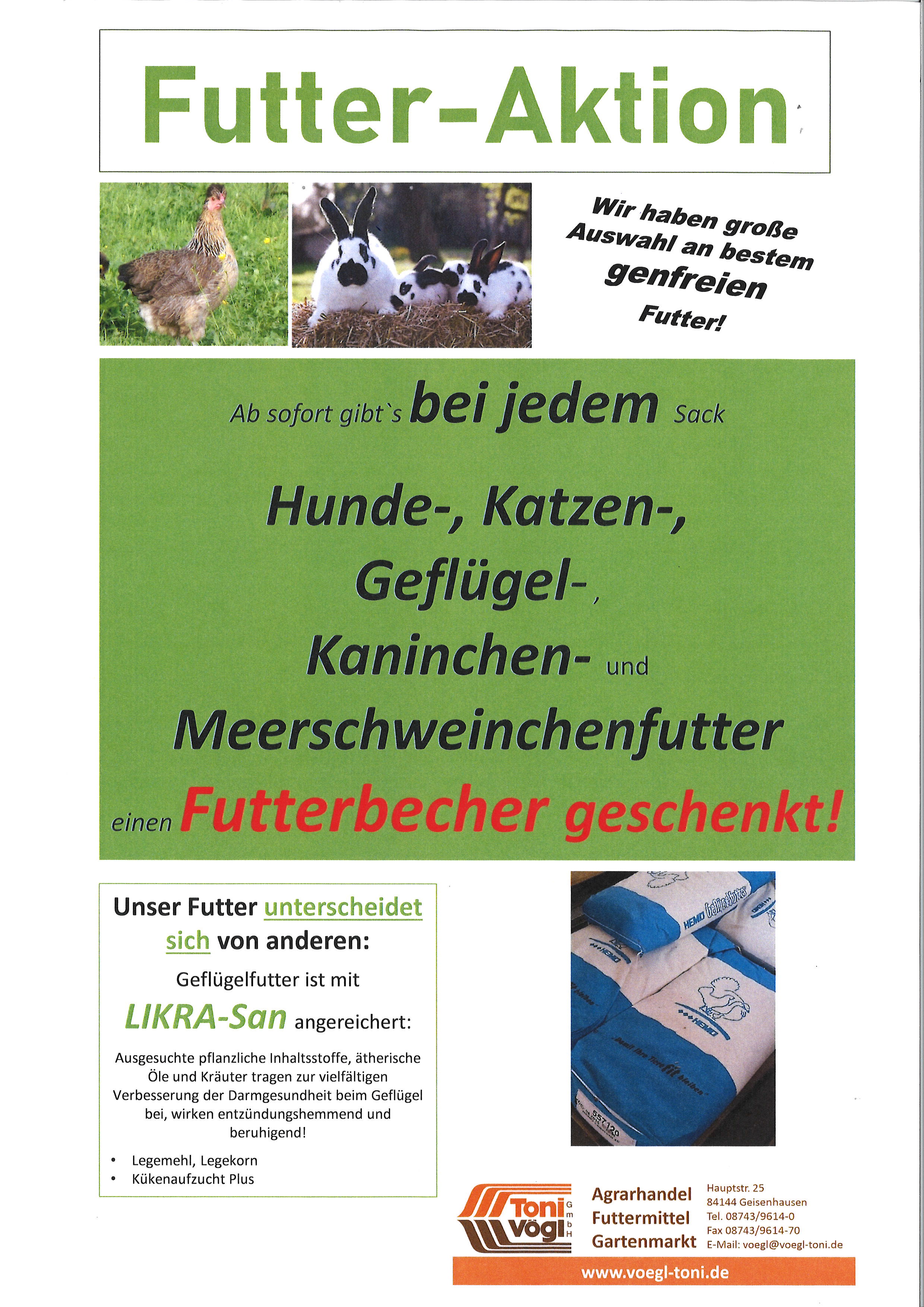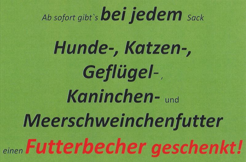 Hobby-Farming liegt voll im Trend! Und diesen Trend fördern wir, denn beim Kauf von einem Sack unseres Futters gibt’s ab sofort einen Futterbecher gleich gratis dazu! Ganz egal für welche Kleintiere Sie einen Sack Futter von uns kaufen, ob für Hunde-, Katzen-, Kaninchen-, Geflügel- oder für Meerschweinchen! Wir haben eine große Auswahl an genfreiem Futter! Gerade beim Geflügelfutter bieten wir eine große Auswahl an: Legemehl, Legekorn, Enten- / Gänse-/ Geflügelmast, Kükenaufzucht oder Geflügelkörnerfutter! Unser Geflügelfutter unterscheidet sich von anderen Futtern: Denn alles Geflügelfutter ist zusätzlich mit LIKRA-SAN angereichert: