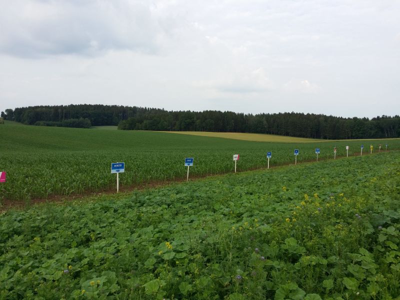 Es ist soweit - unser Versuchsfeld für die Demonstration verschiedener Maissorten ist ausgeschildert. Der Mais wurde am 11.04.2020 angebaut. Wir stellen 27 verschiedene Sorten Mais von fünf verschiedenen Züchtern vor. Die Sorten unterscheiden sich im Reife-Zeitpunkt und ob er gehäckselt oder gedroschen wird. Je nach Anspruch des Landwirts gibt es daher die entsprechenden Sorten, die mehr Wert auf Kolben und Körnergröße, oder auf die gesamte Masse setzen. Die Firmen AGA Saat, Maas seeds, Saatbau Linz, Eurocorn und DSV preisen ihre besten Sorten zum Vergleich an. Zudem wurde ein Teil des Versuchsfeldes Fahrgassen gebaut und erst zu späterem Zeitpunkt gedüngt. So kann auch diese Methode mit der herkömmlichen Saat verglichen werden. Davor ist der Blühstreifen mit unserer Blühmischung „Blühende Honigquelle“ zu sehen. Die ersten Pflanzen blühen bereits. Die Versuchsanlage kann jederzeit von allen Interessierten besichtigt werden!