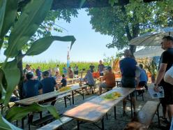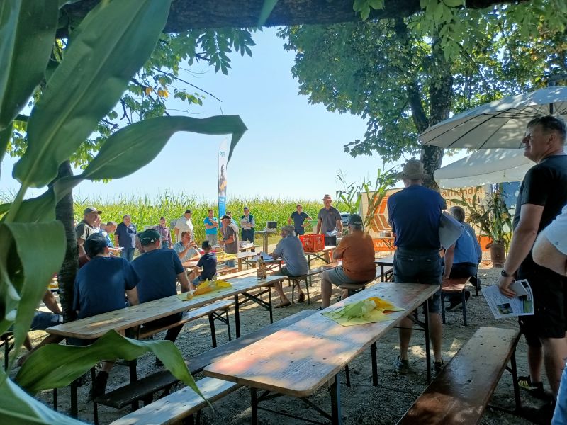 Vergangenen Sonntag hielten wir unseren jährlichen Maisfeldtag ab. Der Zeitpunkt war heuer mit dem 11.08.2024 sehr früh, so dass man sagen kann die 1. Mais-Demo 2024 in der Region. Der Grund für die frühe Führung: Wir haben den Mais bereits am 08.04.24 gesät, das war extrem früh. Laut der Silomais-Prognose der LfL Bayern liegen 2024 die Wärmesummen beim früh gesäten Mais bereits deutlich über dem langjährigen Durchschnitt. Die Siloreife wird beim Mais dadurch eher erreicht. Wie weit der Mais tatsächlich ist, hat man am Sonntag beim Sortenvergleich tatsächlich gesehen. Und mit dem NIRS-Gerät konnten Besucher auch gleich auch die Reife von Ihrem Mais prüfen lassen, oder eine kostenlose Grundfutteranalyse durchführen lassen. So Manches Ergebnis hat wirklich überrascht. Trotz der heißen Temperaturen am Sonntag kamen viele Interessierte. Gezeigt wurden 24 Sorten von 5 verschiedenen Züchtern. Danach konnten sich alle Besucher im schattigen „Mais-Biergarten“ gemütlich bei kühlen Getränken und Brotzeit austauschen.