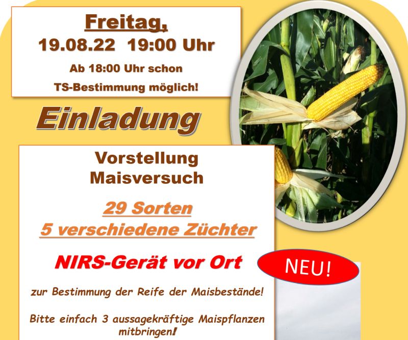 Als neues Highlight wird außerdem ein NIRS-Gerät vor Ort sein. Damit hat jeder Besucher die Möglichkeit, die Reife von seinem Mais bestimmen zu lassen. Dazu werden 3 aussagekräftige Maispflanzen benötigt, die hierfür mitzubringen sind. Ab 18:00 Uhr steht das Gerät zur TS-Bestimmung schon bereit!