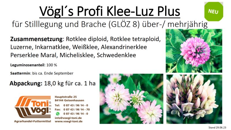 Diese Mischung ist speziell für Stillegung und Brache und ist über-/mehrjährig. Sie ist aus verschiedenen Kleearten sowie Luzerne zusammengesetzt und kann bis ca. Ende September gesät werden. Nähere Infos gibt es gerne bei uns!