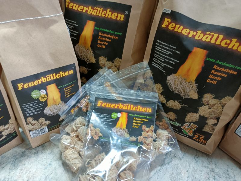 Ab sofort haben wir natürliche Anzünder für Kachelofen, Kamine, Herde, Grill und Ofen. Die Feuerbällchen sind aus reinen Naturprodukten (Wachs und Naturholz). Sie sind extrem sparsam im Verbrauch und brennen ca. 10 Minuten. Sie hinterlassen keine schädlichen Rückstände. Außerdem sind sie universell einsetzbar und zum Anzünden von Holz und Kohle geeignet. Ein weiterer Vorteil ist, dass sie unempfindlich gegen Nässe sind. Die Feuerbällchen gibt es in 500g-, 1kg- und 2,5kg-Packungen. Sie sind unbeschränkt haltbar.
