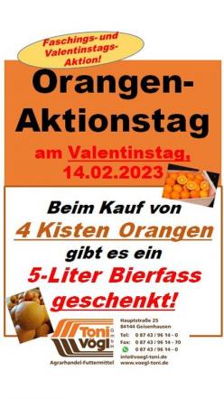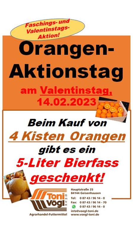 Dass es in Geisenhausen beim Agrarhandel Vögl unwahrscheinlich leckere und schmackhafte Orangen direkt vom Orangenbauern gibt, ist mittlerweile schon landauf und landab bekannt. Die Orangen werden laufend frisch vom Orangenbauern direkt nach der Ernte nach Geisenhausen geliefert. Die Saison ist noch voll im Gange. Bei den Orangen befinden wir uns aktuell in der Haupt-Erntesaison. Die Früchte sind so saftig und süß, dass man beim Essen die Sonne spürt! Ab sofort gibt es die späteren Früchte, sodass die Orangensaison noch bis etwa Ende März andauert. Dies gilt auch für die unbehandelten Zitronen, die einzeln erhältlich sind. Am 14.02.2023 bieten wir eine Mega Faschings- und Valentinstags-Aktion: Beim Kauf von 4 Kisten Orangen auf einmal gibt es ein 5l-Fass Bier GRATIS dazu!