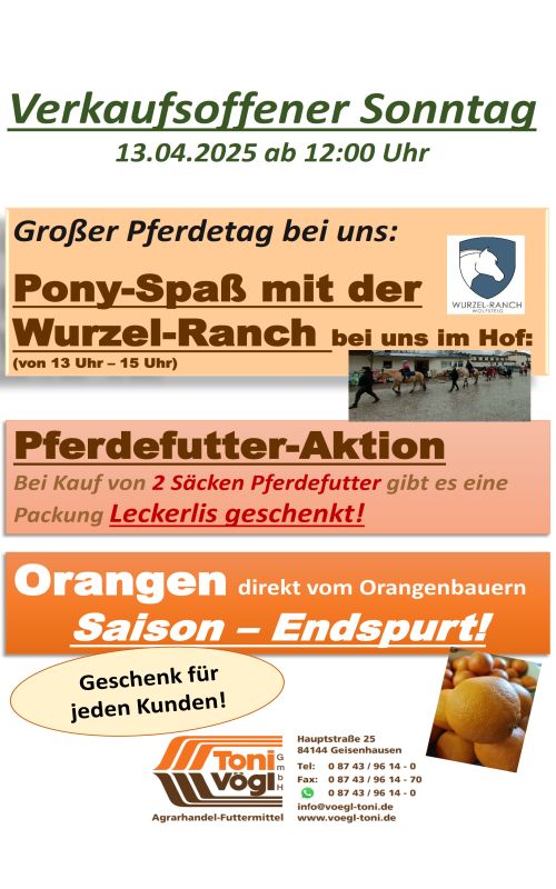 Am Sonntag 13.04.2025 ist in Geisenhausen wieder der Frühlingsmarkt als Abschluss für die Wellness- und Gesundheitswoche. Die Geisenhausener Geschäfte haben von 12-17 Uhr geöffnet. Auch wir, Agrarhandel Vögl, Hauptstr. 25, 84144 Geisenhausen ist ab 12 Uhr geöffnet und es ist wieder allerhand geboten.