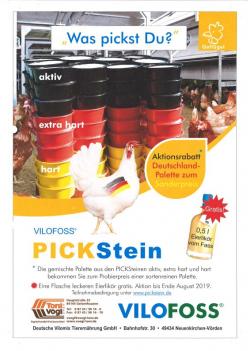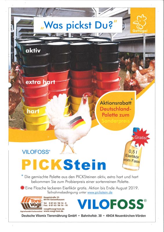 Für das Wohl der Geflügel ist das richtige Beschäftigungsmaterial besonders wichtig. Unsere Vögl`s Profi Picksteine sind dazu genau das richtige und bieten viele Vorteile: Sie unterstützen einen gesunden Stoffwechsel der Tiere. Außerdem fördern sie das Ausleben des arteigenen Verhaltens wie Picken, Schnabelwetzen oder Nahrungssuche und der Knochenaufbau und die Befiederung werden gefördert. Zusätzlich nehmen die Tiere durch die Picksteine lebensnotwendige Salze und Mineralien auf. Die Picksteine gibt es in verschiedenen Härtegraden und Ausführungen: rot: extra hart, gelb: hart, orange: medium, grün: Kräuterpickstein, zusätzlich mit Oregano angereichert und schwarz: für besonders aktive Herden. Nun gibt es eine spezielle Aktion: Eine gemischte Palette aus den Picksteinen aktiv, extra hart und hart zum Probierpreis einer sortenreinen Palette! Eine Flasche leckeren Eierlikör gibt es ebenso GRATIS dazu. Die Aktion läuft noch bis Ende August 2019! Nähere Infos gibt es natürlich jederzeit bei uns!