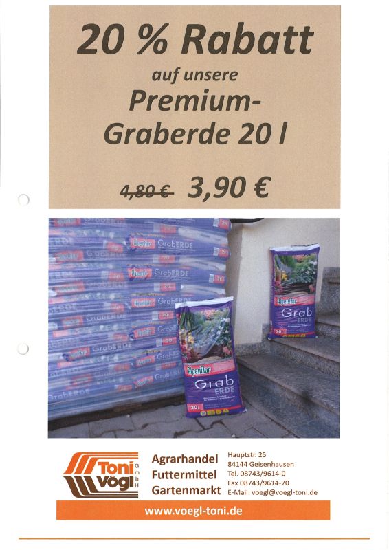 In unserem Sortiment bieten wir für Sie Graberde in höchster Qualität an. Es handelt sich um eine hochwertige Spezialerde die sowohl für die Grababdeckung als auch für die Bepfanzung geeignet ist. Sie hat eine sehr gute Streufähigkeit. Unsere Graberde ist naturschwarz, frei von Farbstoffen und Klärschlamm. Sie ist auch zur Direktbepflanzung gut geeignet. Derzeit gibt`s 20 % Rabatt auf unsre 20l-Säcke!