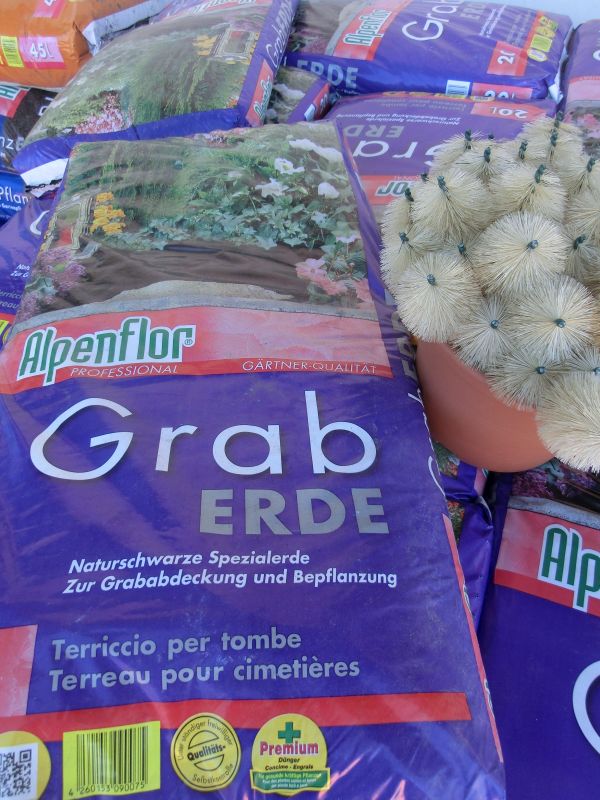 Allerheiligen naht und die Gräber werden hergerichtet – gute Erde ist da Grundvoraussetzung. Unsere Graberde ist eine hochwertige, naturschwarze Spezialerde für die Grababdeckung und Bepflanzung. Sie zeichnet sich durch gute Streufähigkeit aus. Außerdem ist sie frei von Farbstoffen und Klärschlamm. Die Anwendung wird folgendermaßen empfohlen: Nach der Bepflanzung die Erde auf den freien Flächen zur Abdeckung in einer Stärke von 2 – 3 cm auftragen. Es ist empfehlenswert, nach jeder Bepflanzung eine neue Schicht Graberde aufzutragen. Aber unsere Erde ist auch zur Direktbepflanzung gut geeignet. Und nicht vergessen - die dazugehörigen Weihwasserpinsel, die finden sie natürlich auch bei uns!