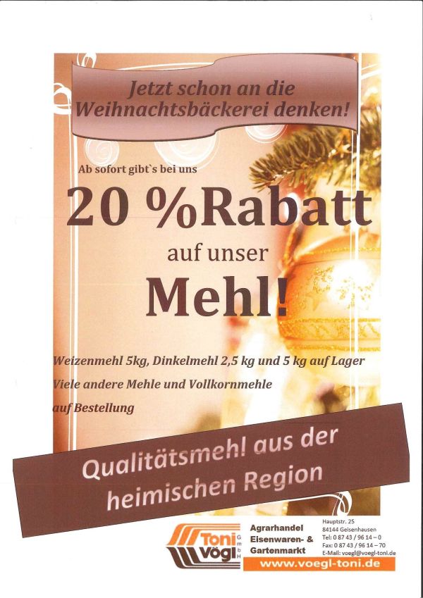 Die Tage werden kürzer und langsam kommt die Zeit, in der man es sich mit einer Tasse Tee gern auf der Couch gemütlich macht. Leckeres Gebäck darf hier nicht fehlen. Langsam hat man wieder mehr Zeit und Lust zu backen, egal ob Süßes, Weihnachtsgebäck oder selbstgemachtes Brot. Wir haben hierfür jedenfalls das richtige Mehl für Sie! Unser Mehl stammt aus einer nahen Mühle. Das gemahlene Getreide aus der Region. Die Qualität und Frische ist garantiert. Somit wissen Sie, was Sie essen. In unserem Sortiment haben wir Weizen- und Dinkelmehl in 5 kg und 2,5 kg ständig auf Lager. Aber Sie erhalten viele andere Mehle, wie Vollkornmehle oder Doppelgriffiges Mehl auf Bestellung. Überzeugen Sie sich von unserem guten Mehl und nutzen Sie unsere aktuelle Aktion: derzeit bieten wir 20 % Rabatt auf unser Qualitätsmehl! Also los und genießen Sie Selbstgebackenes!