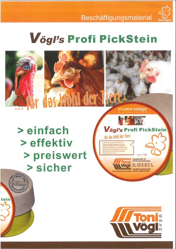 Unsere Vögl`s Profi Picksteine! Sie sind einfach in der Handhabung, effektiv, preiswert und sicher! Die Profi Picksteine unterstützen den gesunden Stoffwechsel der Tiere, fördern die Aktivität und Beweglichkeit und enthalten wichtige Mineralien und Salze. Außerdem ist das QS-fähige Futtermittel auch für Bio-Betriebe zugelassen!