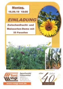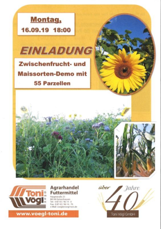 Wir, die Firma Toni Vögl GmbH aus Geisenhausen laden herzlich zur Vorstellung unseres Schauversuchs mit insgesamt 55 Parzellen am 16.09.2019 ab 18:00 Uhr in Oberfimbach ein! Gestartet wird mit dem Maisversuch, der 26 Arten von 4 Züchtern umfasst. Die Vertreter der Firma Aga-Saat, Eurocorn, MAS Seeds und Saatbau Linz stellen ihre neuesten und interessantesten Maissorten vor. Ab ca. 18:45 Uhr wird übergegangen auf die Zwischenfruchtversuchsanlage, die am 28.07.2019 mit 27 Parzellen angelegt wurde. Hier präsentiert Josef Meindl von der Fa. Andreae Saaten verschiedene Zwischenfrüchte, Energie- und GPS-Pflanzen sowie zahlreiche Einzelsaatgutmischungen. Auch 2 Parzellen Bio-Zwischenfruchtmischungen sind heuer wieder dabei, sodass auch Landwirte mit ökologischer Landwirtschaft herzlich willkommen sind! Bei der Demonstration werden Fragen zur Sortendemonstration, Anbau, Bestandsführung und Ernte erläutert. Jeder Besucher kann sich dadurch ein Bild der einzelnen Pflanzen machen und für sich entscheiden: Welche Saatgutmischung ist die Richtige für meinen Betrieb? Das Team der Fa. Vögl freut sich auf viele Besucher - egal ob Betriebsleiter, Frauen, Kinder und Senioren. Natürlich sind auch alle Freunde, Bekannte und sonstigen Interessenten wie z.B. Jäger und Imker herzlich willkommen. Wem 18:00 Uhr zu früh ist, kann gerne auch später zur Zwischenfrucht-Demo ab 18:45 Uhr dazustoßen!