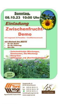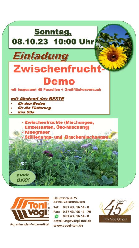 Geisenhausen/Hohenegglkofen. Am Sonntag, 08.10.2023 findet um 10:00 Uhr unser Zwischenfrucht-Feldtag in Oberfimbach statt. Es wird die Demo-Anlage mit insgesamt 40 verschiedenen Parzellen an Zwischenfrüchten, Kleegräser und Stilllegungs- und Brachemischungen präsentiert. Es werden sowohl Mischungen als auch Einzelsaaten und eine Öko-Variante vorgestellt. Ebenso ist ein Großflächenversuch zu sehen. Die Vorstellung erfolgt gemeinsam mit der Firma Andreae Saaten Regensburg.