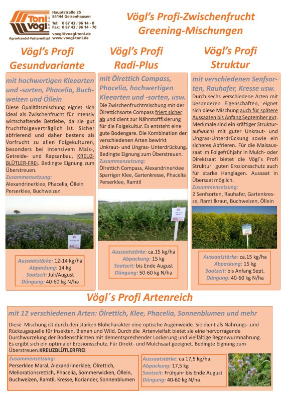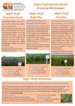 Wir bieten verschiedene Mischungen für die Zwischenfrucht an. Für jede Fruchtfolge können wir die passende Vögl`s Profi-Mischung anbieten, die auch für Greening geeignet sind. Möglich sind Kreuzblütlerfreie Varianten für Rapsfruchfolgen oder blühfreudige Arten, die bienenfreundlich sind und einen Farbtupfer in der Landschaft darstellen. Unterschiedliche Leguminosen-Anteile von 0 bis 50 % sind im Zuge der neuen Düngeverordnung wichtig. Unser Saatgut ist seit Jahren praxiserprobt und wird jährlich auf eigenen Versuchsfeldern geprüft und bei öffentlichen Vorführungen veranschaulicht. Auch heuer im Frühjahr hat sich gezeigt wie gut unsere Mischungen funktionieren und sicher abfrieren.